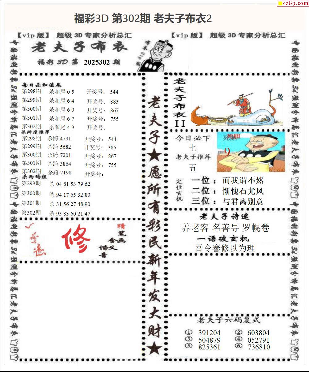 老夫子布衣2025302期3d图谜